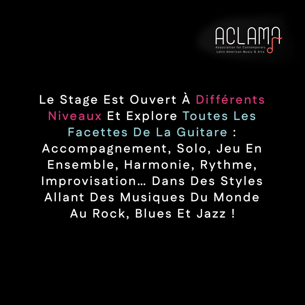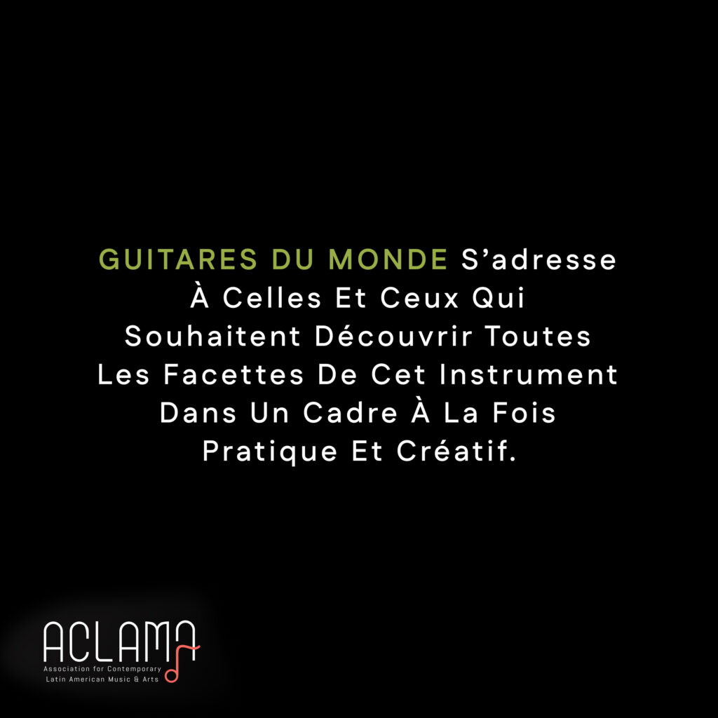 The workshop “Guitares du Monde” is aimed at those who wish to discover all the facets of this instrument in a practical and creative environment. The guitar is explored in all its richness: as an accompanying instrument, as a member of an ensemble, or in solo roles.